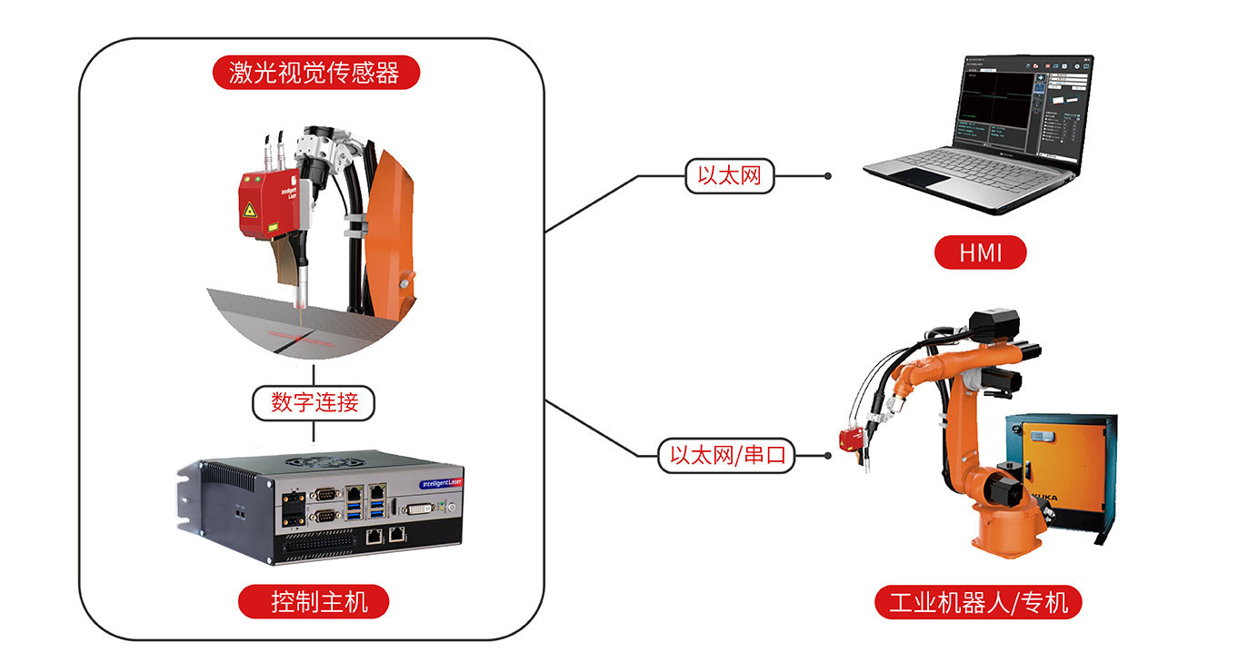 激光視覺(jué)焊縫跟蹤系統(tǒng)主要由激光傳感器和控制主機(jī)組成,激光傳感器用于焊縫信息的主動(dòng)采集,控制主機(jī)負(fù)責(zé)焊縫信息的實(shí)時(shí)處理,并與工業(yè)機(jī)器人或焊接專機(jī)保持實(shí)時(shí)通信,同時(shí)具有尋位和跟蹤功能,滿足智能化焊接的需求。